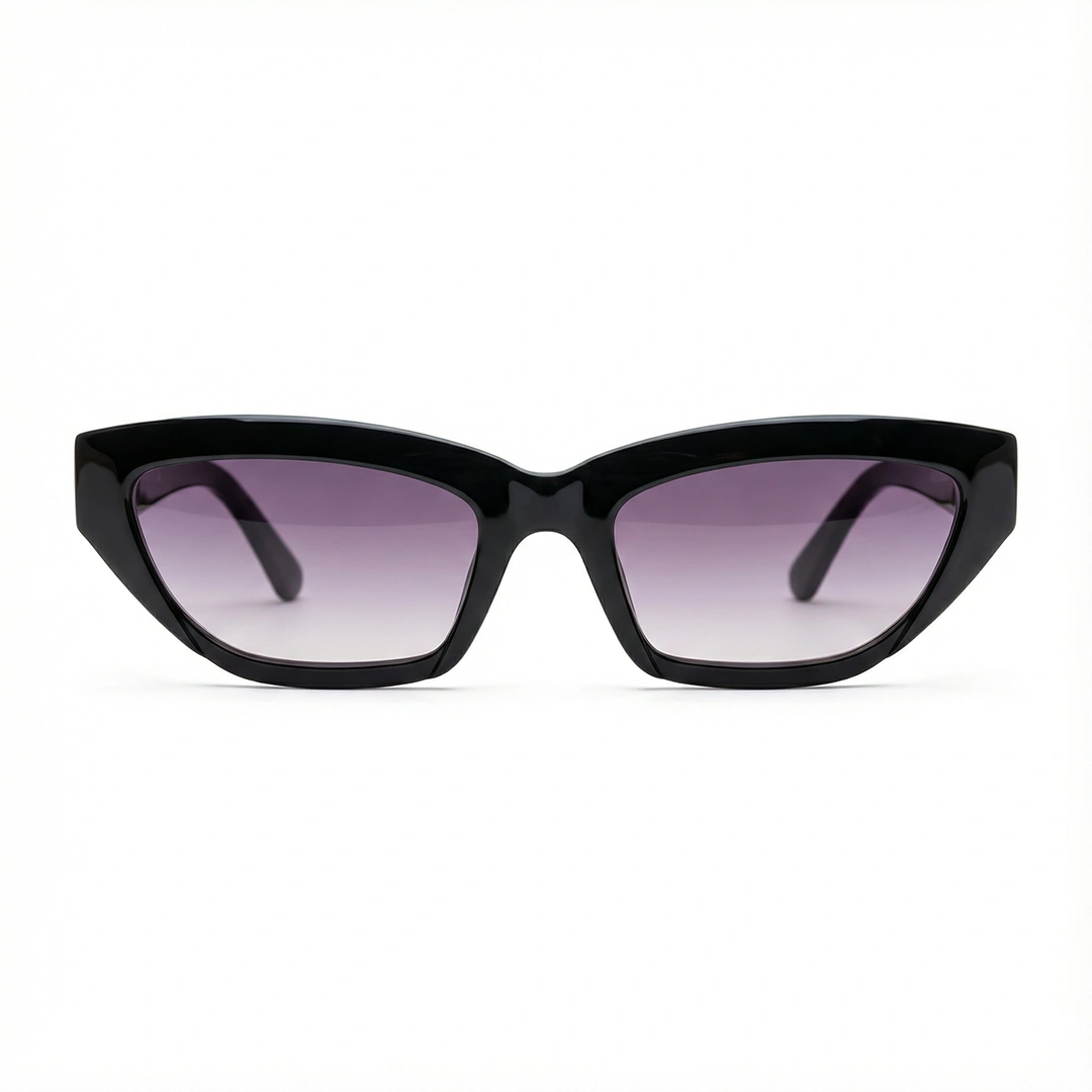 Armação preta gatinho moderno com lente degradê lilás fumê. Estilo imediato no look.